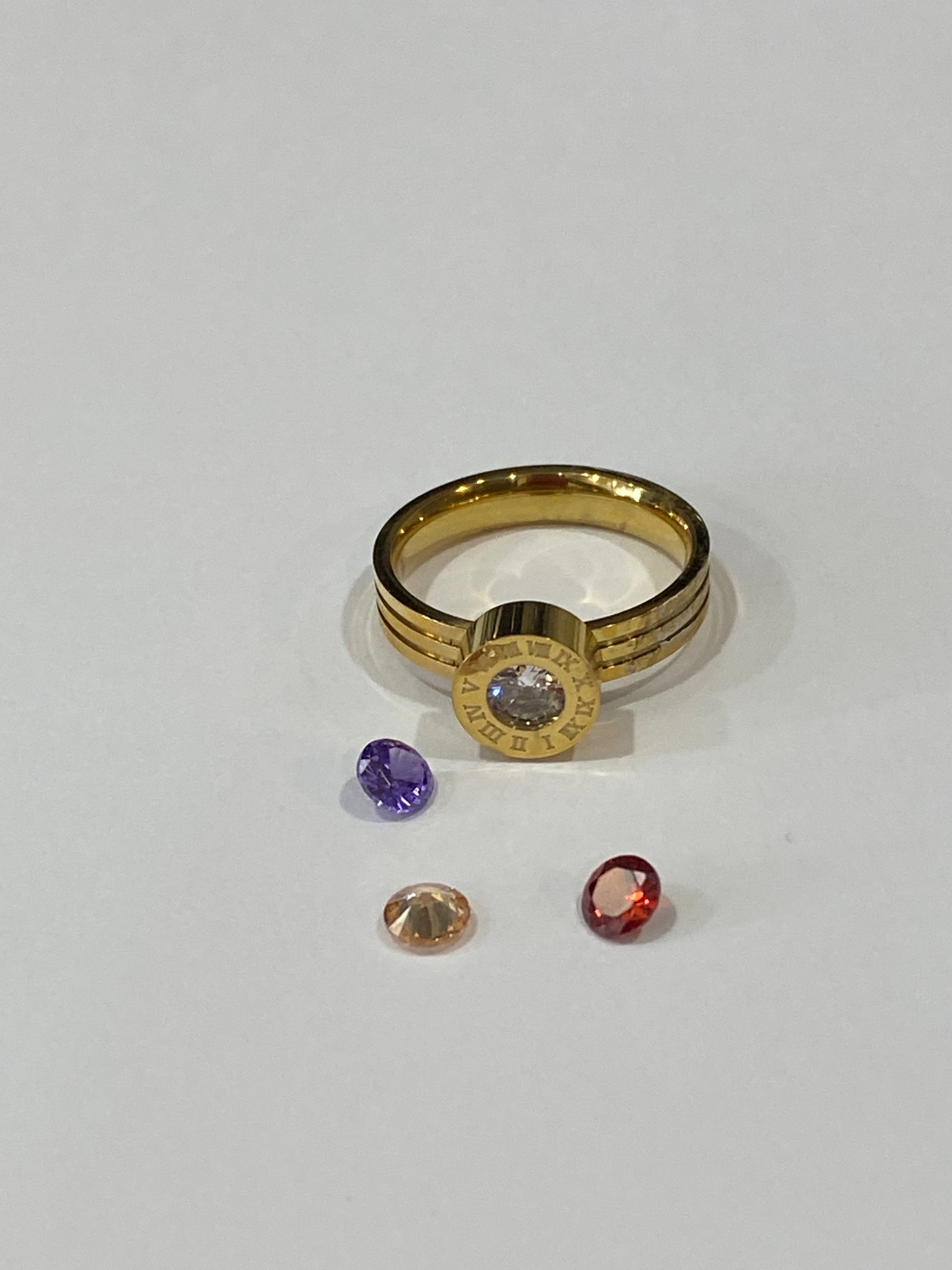 Bague interchange avec multiples couleurs de gemmes en acier inoxydable doré son anneau est serti d’une pierre précieuse artificielle.Â
