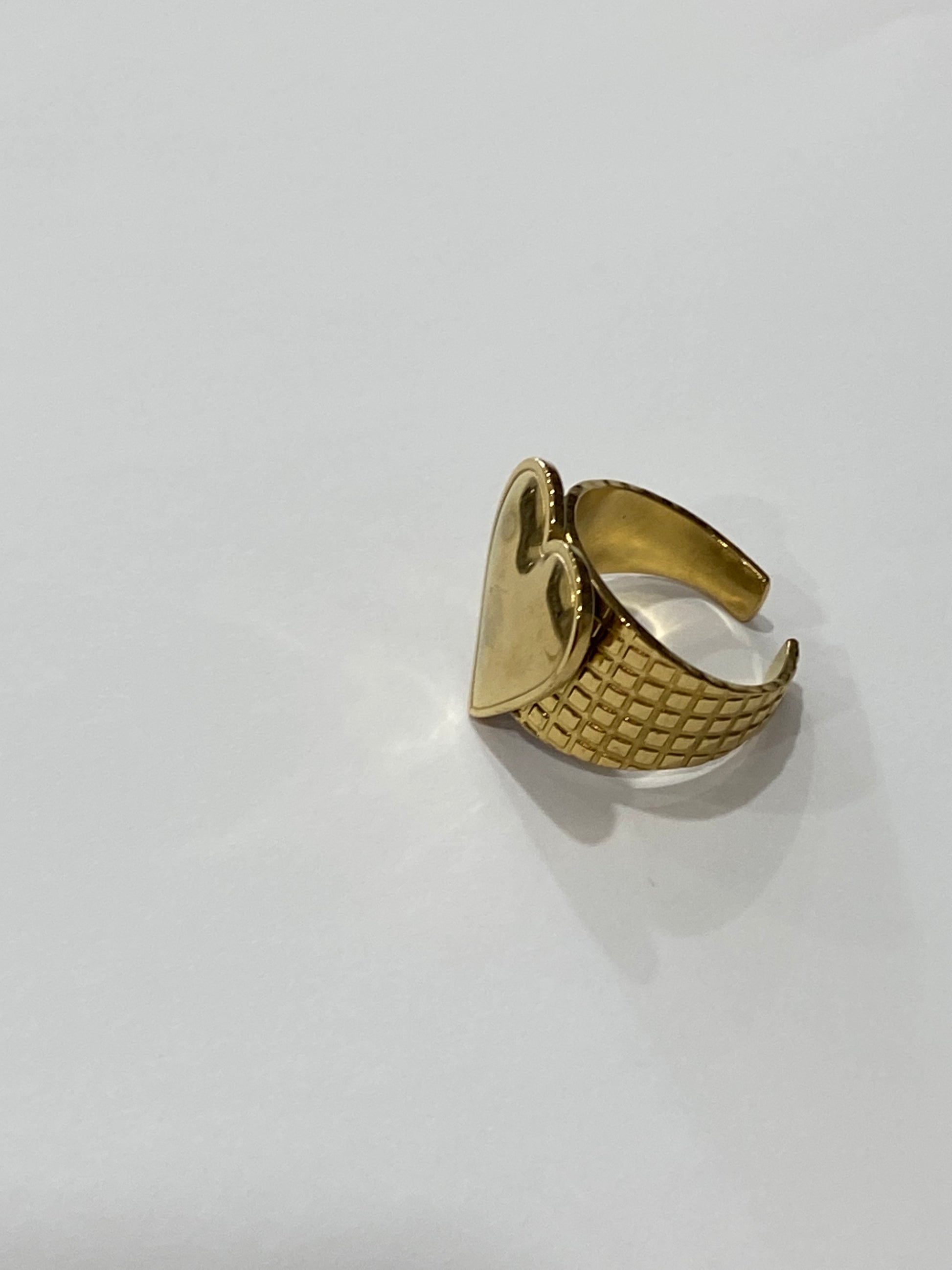 Bague large en acier inoxydable doré, gravée finement pour un lustre subtil, avec motif de cœur emblématique, il symbolise l’amour éternel.